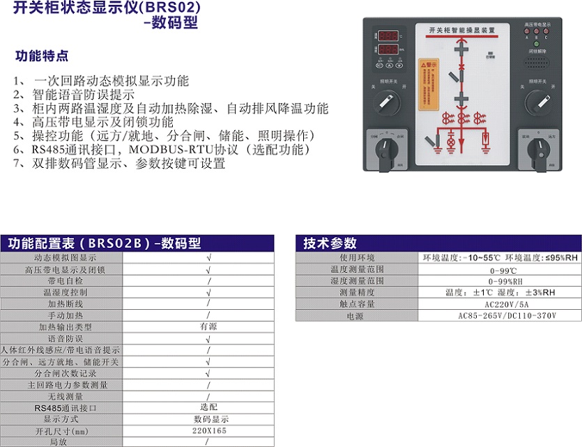 BRS02B開關(guān)柜智能操顯裝置是根據(jù)當(dāng)前高壓系統(tǒng)開關(guān)柜技術(shù)發(fā)展而設(shè)計(jì)開發(fā)的一種新型的模塊化、智能型的操作測(cè)量顯示控制裝置。產(chǎn)品集中指示一次回路模擬狀態(tài)、手車位置、隔離刀位置、接地刀位置、開關(guān)狀態(tài)、操作機(jī)構(gòu)儲(chǔ)能狀態(tài);帶有高壓帶電指示、帶電閉鎖輸出、自動(dòng)加熱除濕、實(shí)時(shí)數(shù)字顯示溫濕度值及加熱器故障監(jiān)測(cè)、超高溫報(bào)警并強(qiáng)制停止加熱、智能語音防誤提示、RS485通信接口等多種功能,簡化了開關(guān)柜面板設(shè)計(jì),美化了部局,完善了開關(guān)狀態(tài)指示功能和安全性能。目前該系列產(chǎn)品已廣泛地應(yīng)用于電力、化工、鐵路、礦山、冶金、水泥等諸多行業(yè)。