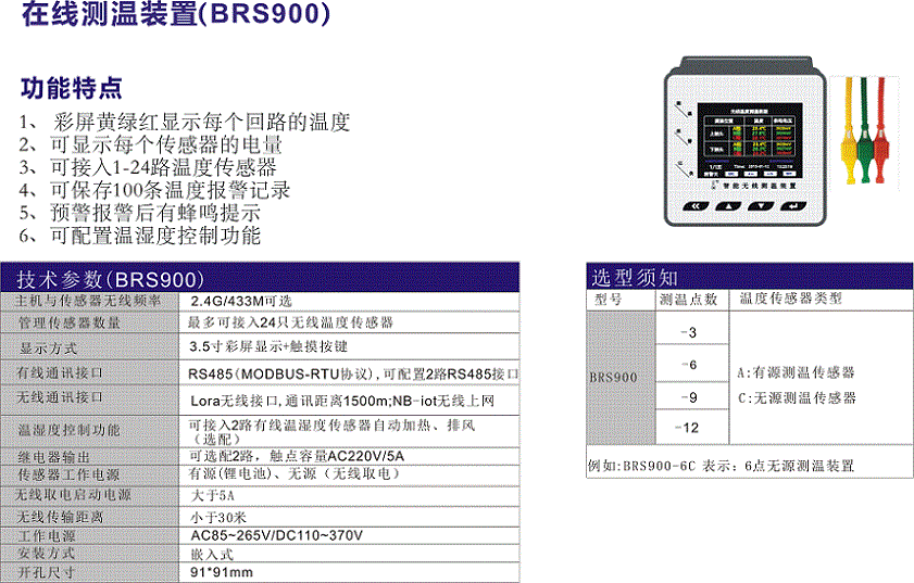 BRS900在線測(cè)溫裝置可以單獨(dú)安裝在高壓柜、低壓抽屜內(nèi),每臺(tái)裝置可以接收24個(gè)傳感器的數(shù)據(jù)。在線測(cè)溫主機(jī)BRS900與溫度傳感器采用無(wú)線電波進(jìn)行信號(hào)傳輸。無(wú)線溫度傳感器可直接安裝在每臺(tái)高壓開(kāi)關(guān)、母線接頭、戶外刀閘或變壓器上。裝置帶有一路485接口,可將采集到的溫度數(shù)據(jù)上傳到監(jiān)控中心。