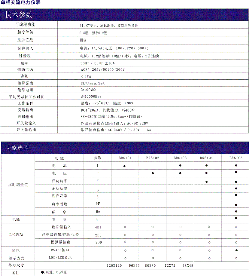 BRS100系列單相交流電力儀表具有交流電力參數(shù)測量、RS485串行輸出、模擬量輸出、接點輸出等功能。能實時顯示被測電量值、電能,可手動或上位機設定地址、波特率、變比、模擬量輸出、繼電器輸出,具有性價比高、穩(wěn)定性好等特點,是一款經(jīng)濟、實用的單相交流電力參數(shù)測量儀表。