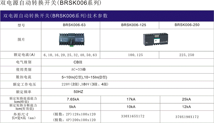 BRSK006系列雙電源自動轉換開關是終端型自動切換裝置,適用于交流50HZ,額定電壓400V/230V;額定電流6A-250A的三相四線(也可用于一相一線)雙路供電電網中,當一路電源發(fā)生故障(檢測常用A相電壓及備用A相電壓,失壓和缺相)時自動將一個或幾個負載電路從一路電源接至另一路電源,以保證負載電壓的正常供電。