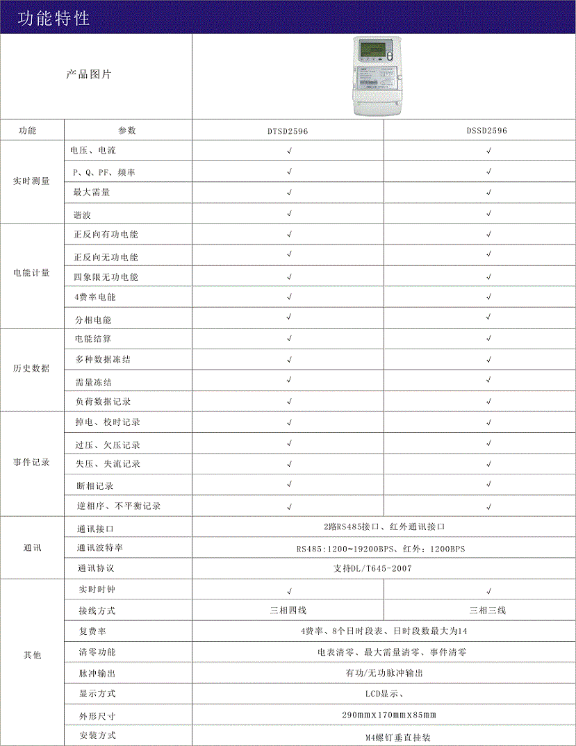 該系列三相電子式多功能電能表帶有LCD點(diǎn)陣液晶顯示、日歷時(shí)鐘,標(biāo)準(zhǔn)RS485通訊接口、紅外線通訊。它集眾多功能于一體,實(shí)現(xiàn)三相有功(雙向)、無功(四象限)、視在電能計(jì)量、需量計(jì)量;并依據(jù)相應(yīng)費(fèi)率進(jìn)行電能、需量的分時(shí)計(jì)量,測(cè)量電壓、電流和功率因數(shù)等電參數(shù);并具有失壓、失流、斷相等事件記錄、報(bào)警功能,能有效及時(shí)地滿足用戶對(duì)用電現(xiàn)代管理的需求,可應(yīng)用于電廠、變電站、中高壓系統(tǒng)商業(yè)、工業(yè)及各類企事業(yè)單位。