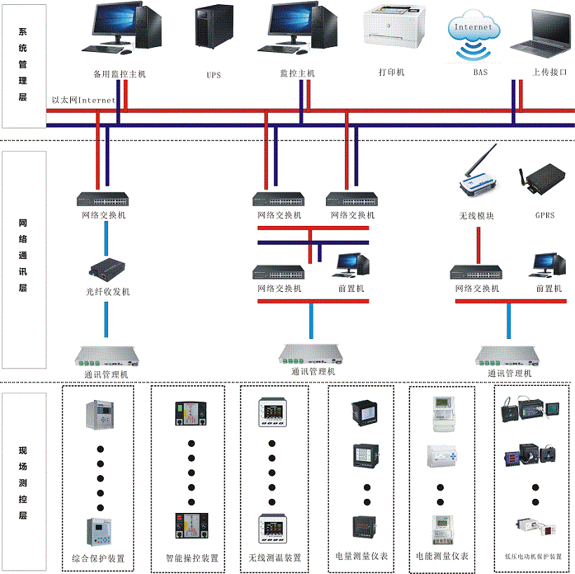BRSX3000分布式全微機(jī)綜合自動(dòng)化系統(tǒng)是公司向廣大用戶推出的面向設(shè)備對象設(shè)計(jì)生產(chǎn)的新一代模塊化、分層分布式一體化的微機(jī)綜合自動(dòng)化系統(tǒng)。通過多年對中低壓變電站綜合自動(dòng)化系統(tǒng)的研究、開發(fā)和實(shí)際工程經(jīng)驗(yàn),將測量、控制、保護(hù)、記錄、遠(yuǎn)動(dòng)終端功能集于一體以實(shí)現(xiàn)變電站無人值班和微機(jī)綜合自動(dòng)化。該系統(tǒng)面向?qū)ο蟮拈_放式設(shè)計(jì)、極好的兼容性和眾多的規(guī)約支持,可以完全滿足新站建設(shè)和老站改造的需要,它把繼電保護(hù)、測控系統(tǒng)、計(jì)算機(jī)及RTU控制融于一體,在提高安全運(yùn)行水平,優(yōu)化二次系統(tǒng)設(shè)計(jì)和減少控制電纜等方面有其獨(dú)到的特點(diǎn)。BRSX3000電力監(jiān)控系統(tǒng)由監(jiān)控層、通訊管理層、間隔層三層組成,各層之間都具有獨(dú)立的功能,監(jiān)控層的設(shè)備放置在高壓配電室(監(jiān)控值班室)中,通訊管理層的設(shè)備放置在每個(gè)配電室中,每個(gè)配電室的通訊管理機(jī)通過光纖以太網(wǎng)與后臺監(jiān)控計(jì)算機(jī)進(jìn)行通訊,配電室之間完全獨(dú)立。