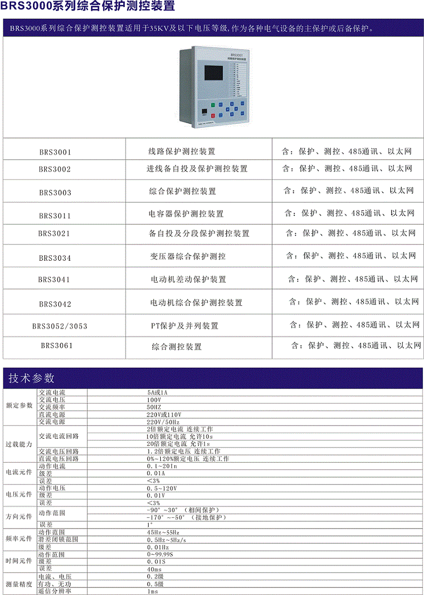 BRS3000系列保護測控裝置是在多年實踐應用和運行經(jīng)驗的基礎上,吸取了國內(nèi)外微機保護裝置現(xiàn)有的先進技術(shù),研制推出的新一代微機保護測控裝置。廣泛適用于電力、水利、石油、化工等行業(yè)35KV及以下電壓等級系統(tǒng),作為各種電氣設備的主保護或后備保護。