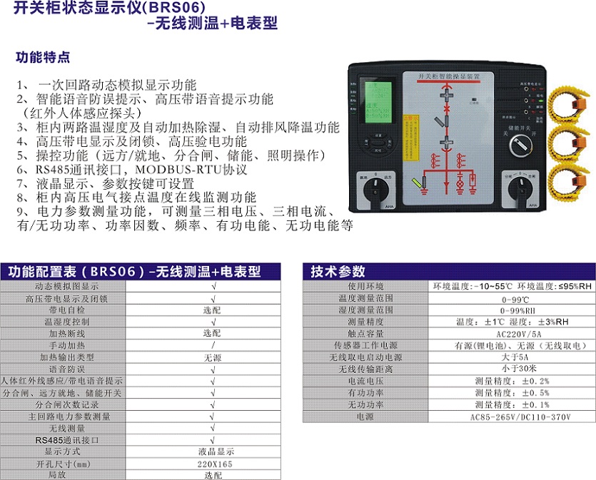 BRS06開關(guān)柜智能操顯裝置是針對目前中壓系統(tǒng)開關(guān)技術(shù)發(fā)展而開發(fā)設(shè)計的一種多功能智能化開關(guān)模擬綜合動態(tài)指示裝置,主要應(yīng)用于電壓等級為0.1~40.5KV的各種戶內(nèi)開關(guān)柜。 產(chǎn)品集中指示一次回路模擬狀態(tài)、手車位置、隔離刀位置、接地刀位置、開關(guān)狀態(tài)、操作機構(gòu)儲能狀態(tài);帶有高壓帶電指示、帶電閉鎖輸出、自動加熱除濕、實時數(shù)字顯示溫濕度值及加熱器故障監(jiān)測、超高溫報警并強制停止加熱、智能語音防誤提示、紅外人體感應(yīng)、柜內(nèi)電氣接點在線測溫、RS485通信接口等多種功能,簡化了開關(guān)柜面板設(shè)計,美化了部局,完善了開關(guān)狀態(tài)指示功能和安全性能的新型電氣裝置。目前該系列產(chǎn)品已廣泛地應(yīng)用于電力、化工、鐵路、礦山、冶金、水泥等諸多行業(yè)。
