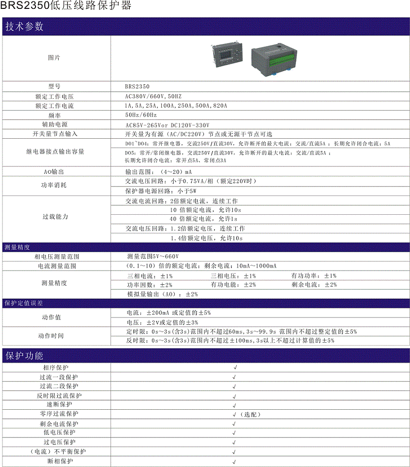 BRS2350低壓線路保護(hù)器為低壓回路提供了一整套集控制、保護(hù)、測(cè)量、計(jì)量和通迅于一體的專業(yè)化解決方案,同時(shí)提供了遠(yuǎn)程自動(dòng)控制、現(xiàn)場(chǎng)直接控制、面板指示、信號(hào)報(bào)警、操作記錄、脫扣報(bào)警記錄及開關(guān)量記錄等功能,大量適用于電力、石化、輕工、煤炭、造紙、鋼鐵、冶金等諸多行業(yè)。